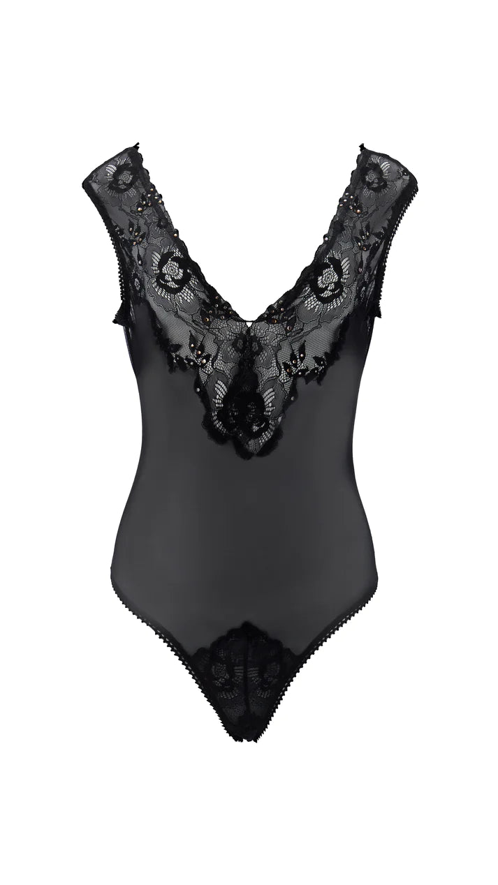 The Cleopatra Bodysuit leaves little to the imagination. Sustainable lace has been carefully handcrafted with Crystals in champagne tone that decorate the cleavage.