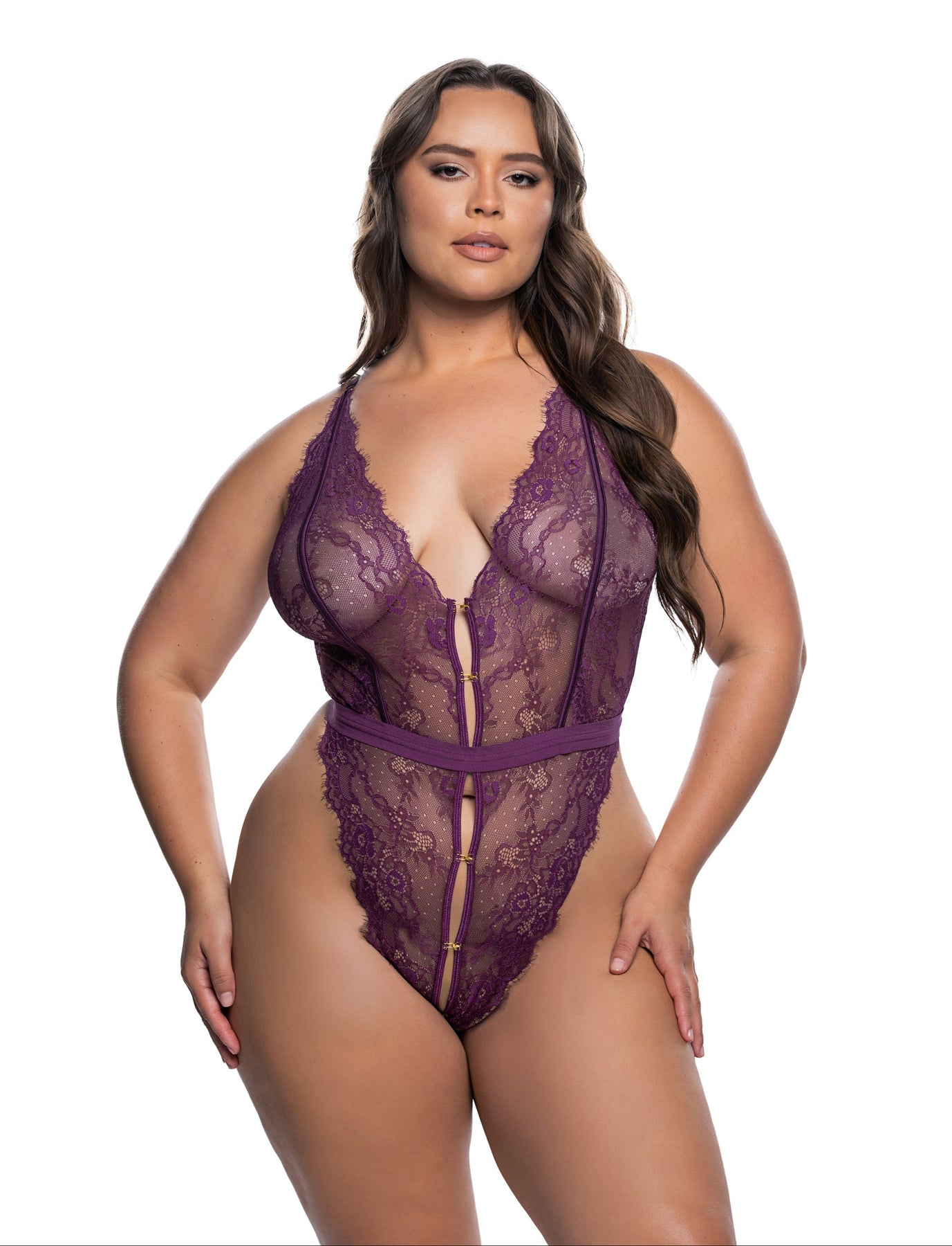 Plus size lingerie model wearing a purple lace women's teddy on a white background