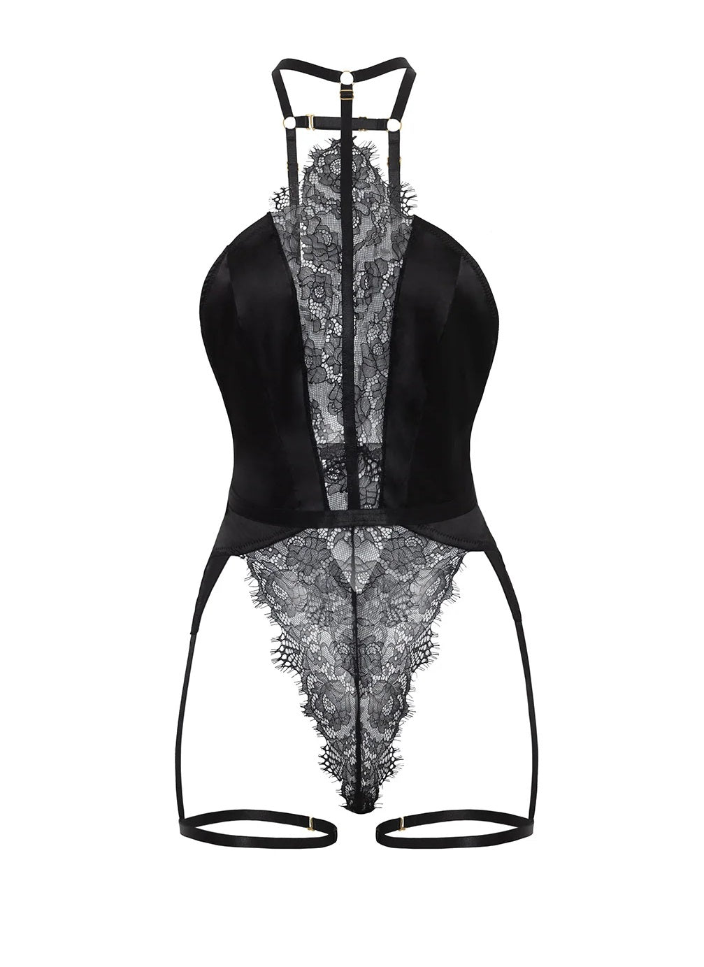 Indulge in the luxurious and exclusive Winnie Harness Lace Teddy, featuring an adjustable harness choker crafted from satin and lace and complemented by attached garter stays. This exquisite bodysuit boasts snap closures for convenience and a thong back for an alluring touch. Pair it with a skirt or pants for a truly stunning look.