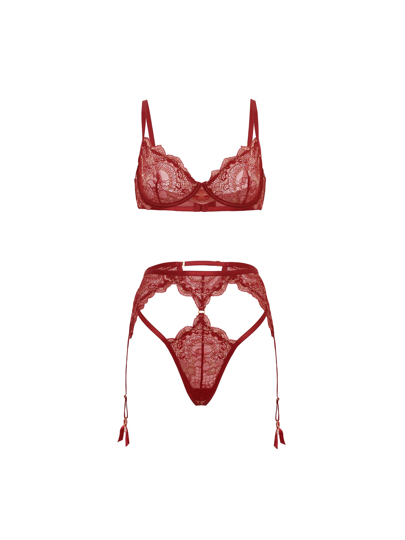 Arielle bra and panty set in red lace with garter straps, featuring unlined cups and peekaboo design for seductive elegance.