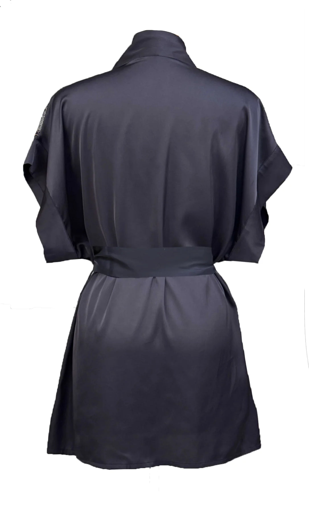 This refined short kimono robe showcases charcoal satin as its foundation, complemented by exquisite Chantilly lace featuring shimmering iridescent blue thread and gold accents. The front presents tasteful cutout details positioned beneath the lace, while the back remains elegantly solid and fully covered. A sleeveless silhouette is anchored by a luxurious satin sash at the waist, creating a polished, defined shape. Crafted from soft, easy-care materials, this piece delivers both visual sophistication and practical wearability for the discerning collector. Wear it with the matching Salkantay Cami and Shorts Set for a luxurious loungewear look!