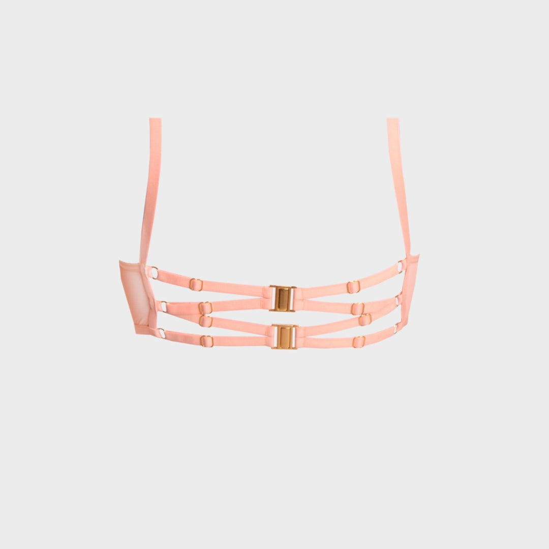 Our bralette is the ultimate expression of modern elegance, featuring gold-plated brooches and figure-flattering lines that embody subtlety and sensuality. With a combination of solid fabrics and transparencies, Its design features double back clasps that provide unique detailing. It’s a versatile piece that can be worn with a blazer and pants to create a winning outfit that exudes confidence and style.