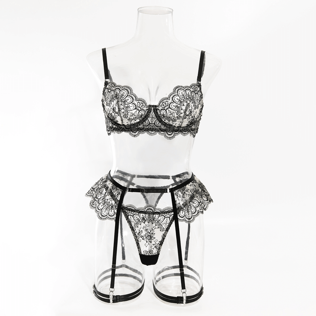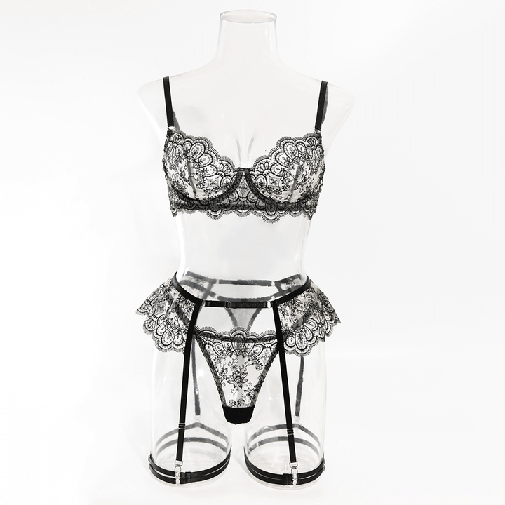 Turn up the heat with the Carmen Lace Lingerie Set, a breathtaking four-piece ensemble that blends romance and seduction. Featuring intricate lace detailing and a sultry sheer design, this set is made to captivate. The underwired balconette bra provides gentle lift and support, while the matching lace thong, ruffled garter belt, and adjustable thigh straps add a daring and playful touch. Perfect for special nights or when you want to feel irresistibly confident.
