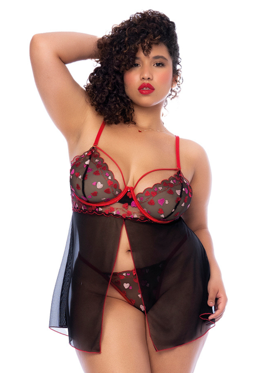 This babydoll with embroidered hearts is a tribute to love, designed to be both romantic and effortlessly alluring. Featuring underwire for support, a flirty front opening, and adjustable straps for the perfect fit. The semi-loose silhouette drapes beautifully, paired with a matching thong to complete the look. A delicate yet bold statement of passion and elegance.