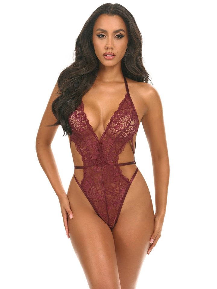 The luxurious Lina Lace Teddy features intricate lace and ring embellishments, creating a stunning and strappy back. Designed with a halter neck and strategically placed cut-outs, this piece offers both style and comfort.