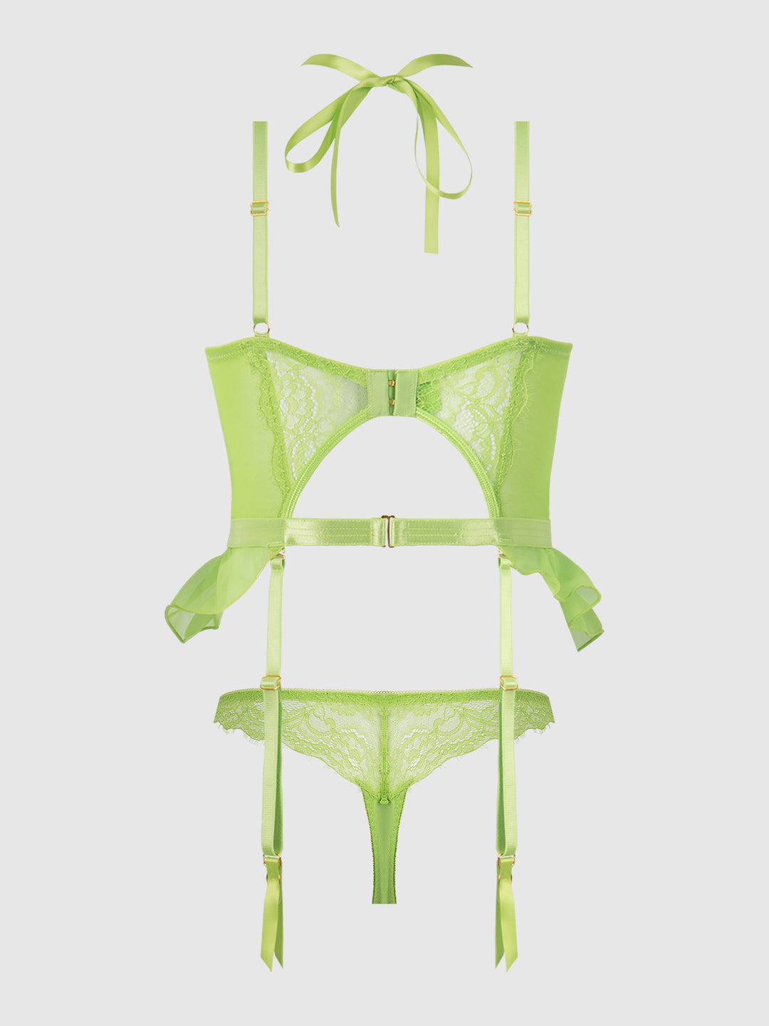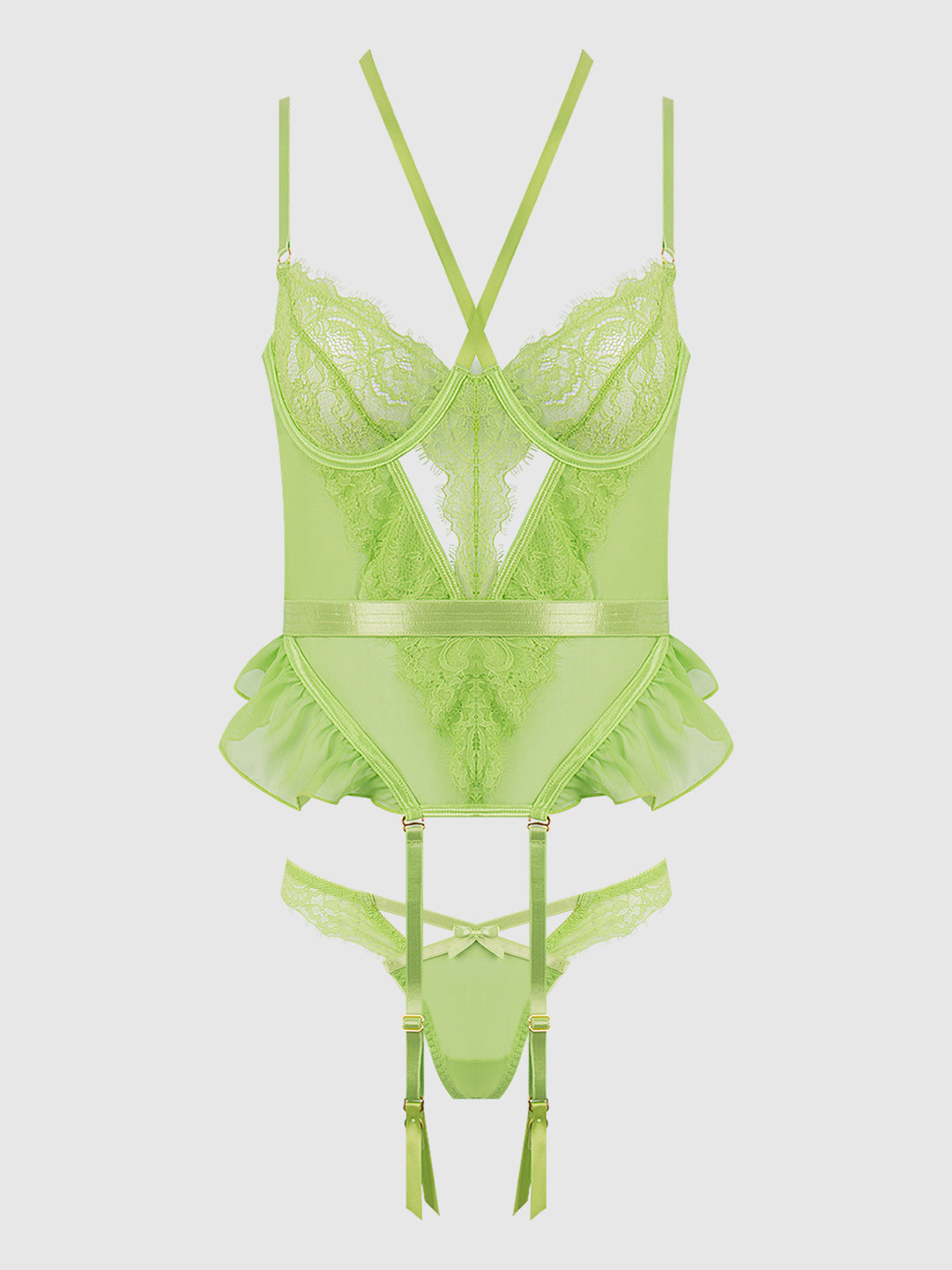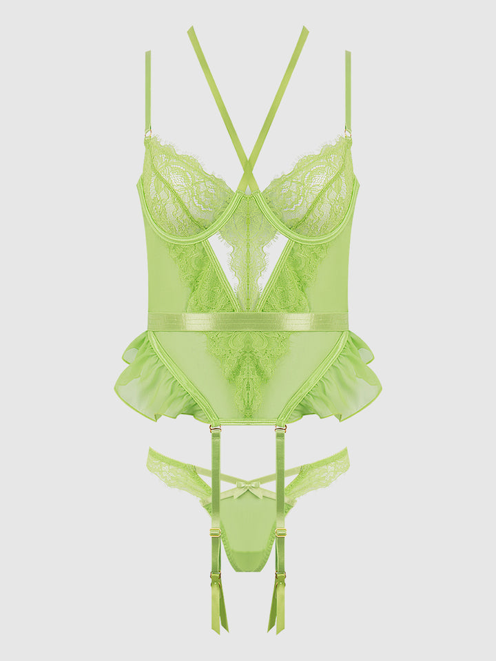 Completing this enchanting set is the matching thong, crafted from the same exquisite lace and satin materials, ensuring a cohesive and stunning ensemble from top to bottom.