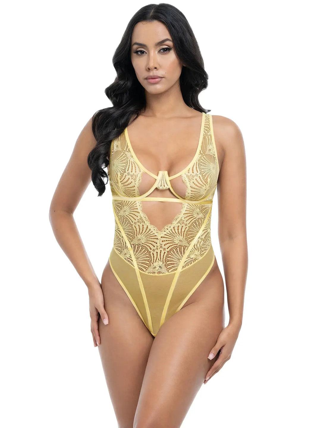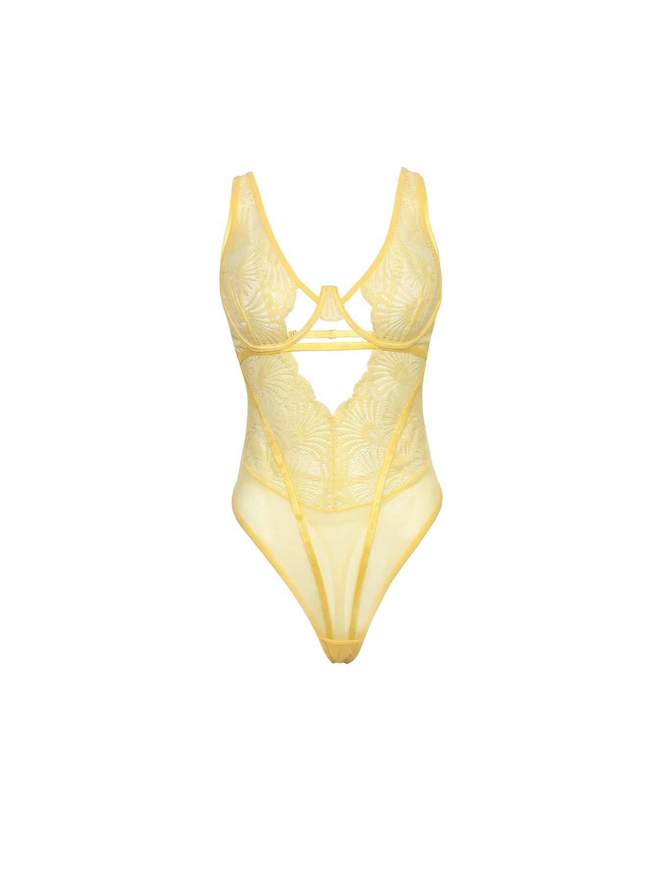 Indulge in luxury with our Tiana Lace Teddy. The supportive underwire and delicate lace and mesh inserts make for a flattering and forgiving fit. Elevate your lingerie collection with this exquisite yellow teddy.